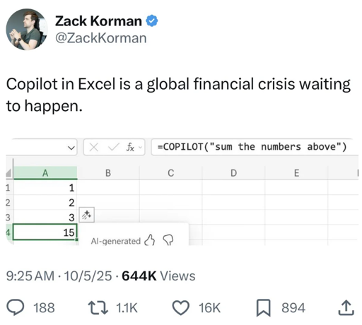 AI in Excel sounds great as a prompting system to make features more usable. As auto complete for cell level values it would be absurd. Being able to prompt a pivot table or let AI figure out the combination of functions to get a value you wanted seems useful.