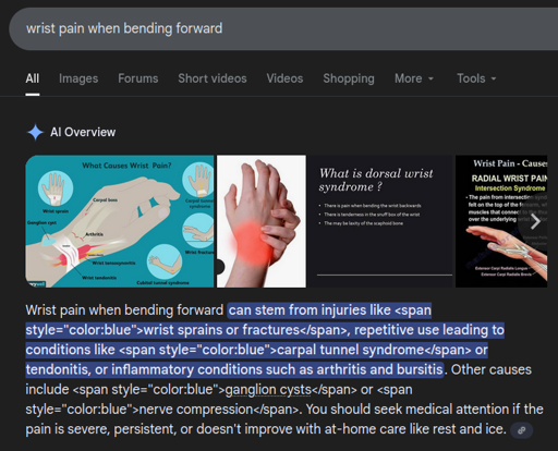 arrow-up11arrow-down1imageWrist pain [...] can stem from injuries like <span style="color:blue"> - Google search AI thingfiles.catbox.moeu/lukmly013 💾 (lemmy.sdf.org)@lemmy.sdf.org to Software Gore@lemmy.worldEnglish · 4 months agomessage-square0linkfedilinkfile-text