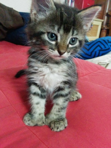 [Image description: a fluffy polydactyl tabby kitten on a red blanket.]