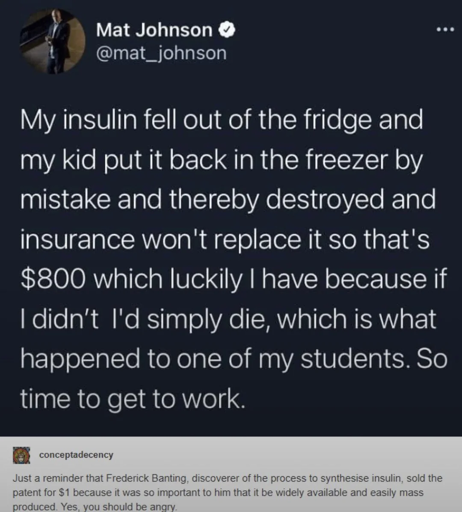 So, start with a baseline mediocre life due to financial constraints. Oh wait, you’re also diabetic. So let’s drop that quality of life further. Now you’re $800 in debt, plus interest. Chances are you’re not paying the balance off next month, and if you’re not paying off the balance then you’re probably using credit to pay for your next batch. Now you’re in a cycle of paying off your debt, similar to payday loans. Your “disposable” income is now shrinking each month. You sacrifice meals, and you don’t do anything enjoyable because most things cost money, but you need your medicine to live. Eventually you end up so deep in the hole that you either have to sell what you have (i.e your home, if you even own one), or claim bankruptcy - which as a low income earner will limit your potential to pick yourself up even further. But wait! You still need to buy your insulin, and now nobody will lend to you. Now you’ve lost the value you’ve built throughout your life AND the debt keeps piling up.
