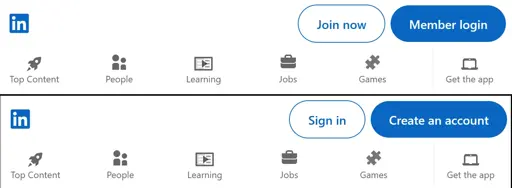 Top screenshot is from a regular instance of Firefox where I’m returning to LinkedIn after having signed out before. Bottom screenshot is from a private browsing session -- no cookies saved, so I guess I look like a new user to them.