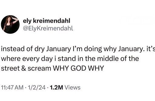 It’s not really related to dry january, but it’s my 2nd time seeing that term this month, and after looking it up to find it’s a real thing, I think it’s a kinda neat (probably) coincidence as the name of january in my native language would roughly translate to “dry month” in english :3