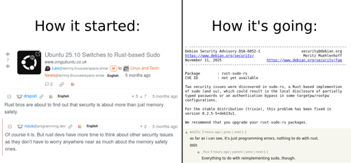 Honestly I have no idea whether sudo-rs is a good idea or not, but I have my doubts that any of the other people (especially the very vocal kind) chiming in on this do. Any time Rust is involved in the Linux community, a lot of vocal critics with very little knowledge of the language or programming in general seem to appear.