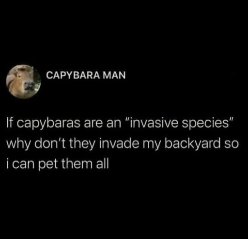 We have invasive nutria in my state. Not as cool as capybara, but I’d befriend one if I could. I’ve never seen them.