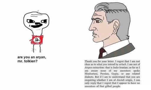 Explanation: Shortly before WW2, a German publisher contacted Tolkien and expressed interest in translating The Hobbit into German. However, they also attempted to verify his “Aryan” descent, so as to suit Nazi Germany’s norms for authors.