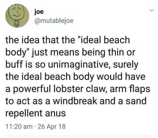 minus-squareUnderpantsWeevil@lemmy.worldlinkfedilinkEnglisharrow-up13·10 days ago This is the ideal beach body. You may not like it, but this is what peak performance looks like.