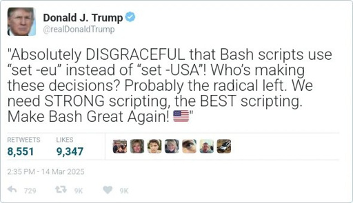 FiveMacs@lemmy.ca to Programmer Humor@programming.dev · 10 months agoMake Bash Great Again!!lemmy.caimagemessage-square1linkfedilinkarrow-up10arrow-down10