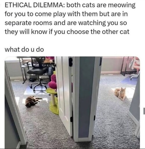 stand in the door way of the cat on the left. maintain eye contact and start conversating immediately with it.