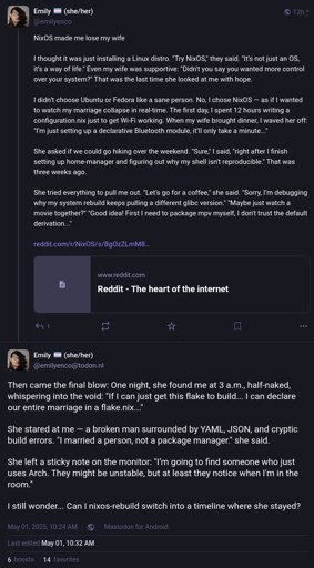 So NixOS is like freebasing Arch, got it. I’m still tempted to spin up a VM, just a taste…