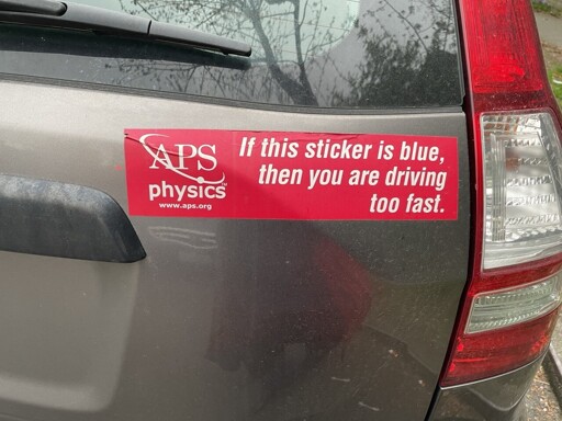 Incidentally, my limited understanding and 5 seconds of research tells me the blueshift and redshift are directly related. One is linked to lower speeds and one to higher speeds. The sticker itself is red, so the joke is saying you must be travelling at some fraction of the speed of light to see the sticker as red and if you were going slower it would appear blue.