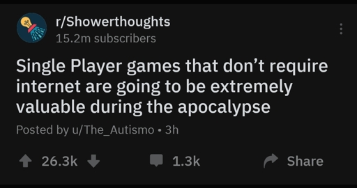 minus-squareMangoholic@lemmy.mllinkfedilinkarrow-up1·2 months agoI think its fresh water, food and than maybe way down the list, its single player games.