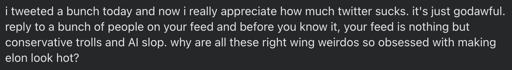 8·16 days agoi was wondering the same thing, lmao. i think elon picked the wrong tweet to reply to. before we know it #bloodygangbangwoman will be trending